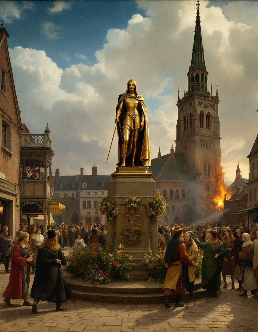 A painting inspired by Jan van Eyck of a brass statue of Joan of Arc in a town square. Townsfolk walk to the harbor on the way. Fire burns in the belfry.