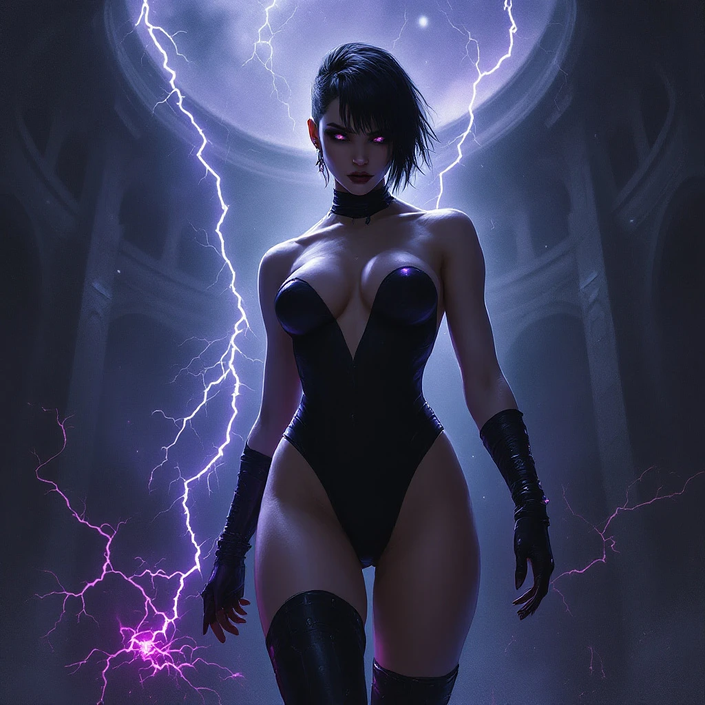 minimalistic painting in the style of warhammer 40k of a female 20 years old comissar, standing infront a gothic circh, channeling lightning magic, cybereyes, black ultra tight onepiece bathsuit, black sidecut hair, very big tits