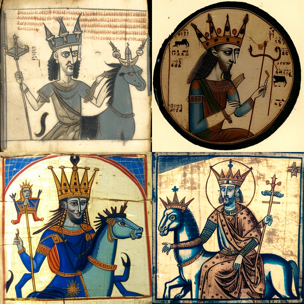 King Paimon depicted as a man with an effeminate face (a strong man with a woman's face according to other scholars) , wearing a precious crown, and riding a dromedary. Before him often goes a host of demons and ghouls with the shape of men, playing trumpets, cymbals, and any other sort of musical instruments.