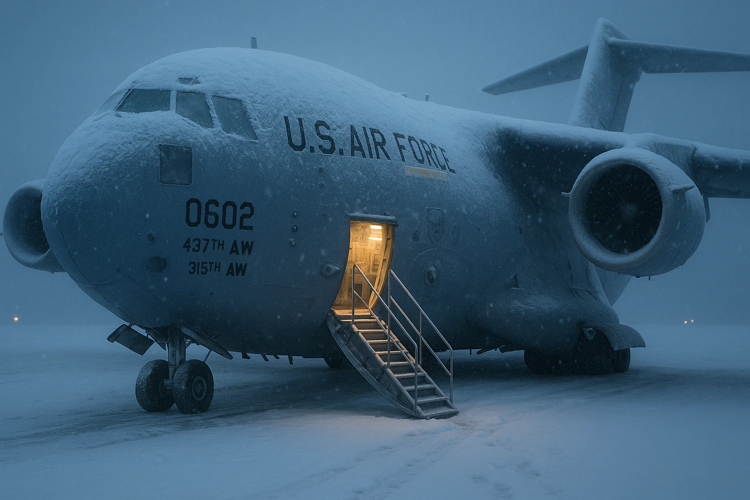 Boeing C-17 Globemaster III, heavily covered in snow and frost, cockpit windows, "0602", "437th AW", "315th AW", "U. S. AIR FORCE", open cargo door, stairs extended, brightly lit interior, thick layer of snow, faint lights on snowy tarmac, dawn or dusk or day with heavy overcast.