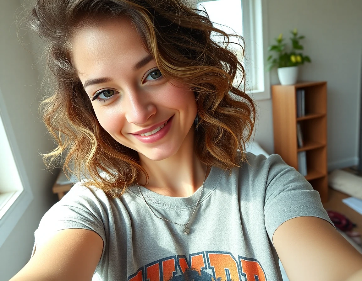 An ultra-realistic smartphone selfie of a young woman in her mid-20s. The photo has the characteristic sharpness and vivid color of a high-end smartphone camera, with slight motion blur on one edge. The image is taken in natural daylight, causing mild overexposure on one side of her face. She has shoulder-length curly hair with grown-out highlights, and wears minimal, everyday makeup with slightly smudged eyeliner. Her expression is a genuine, slightly lopsided smile with a hint of tiredness around her eyes. She's wearing a comfortable, well-worn graphic t-shirt with a faded band logo. A thin silver necklace is partially tangled in her hair near her collar. The background is a lived-in studio apartment, with a unmade bed and a small bookshelf visible. A houseplant with a few yellowing leaves sits on a windowsill behind her. There's a small coffee stain barely visible on the collar of her shirt.