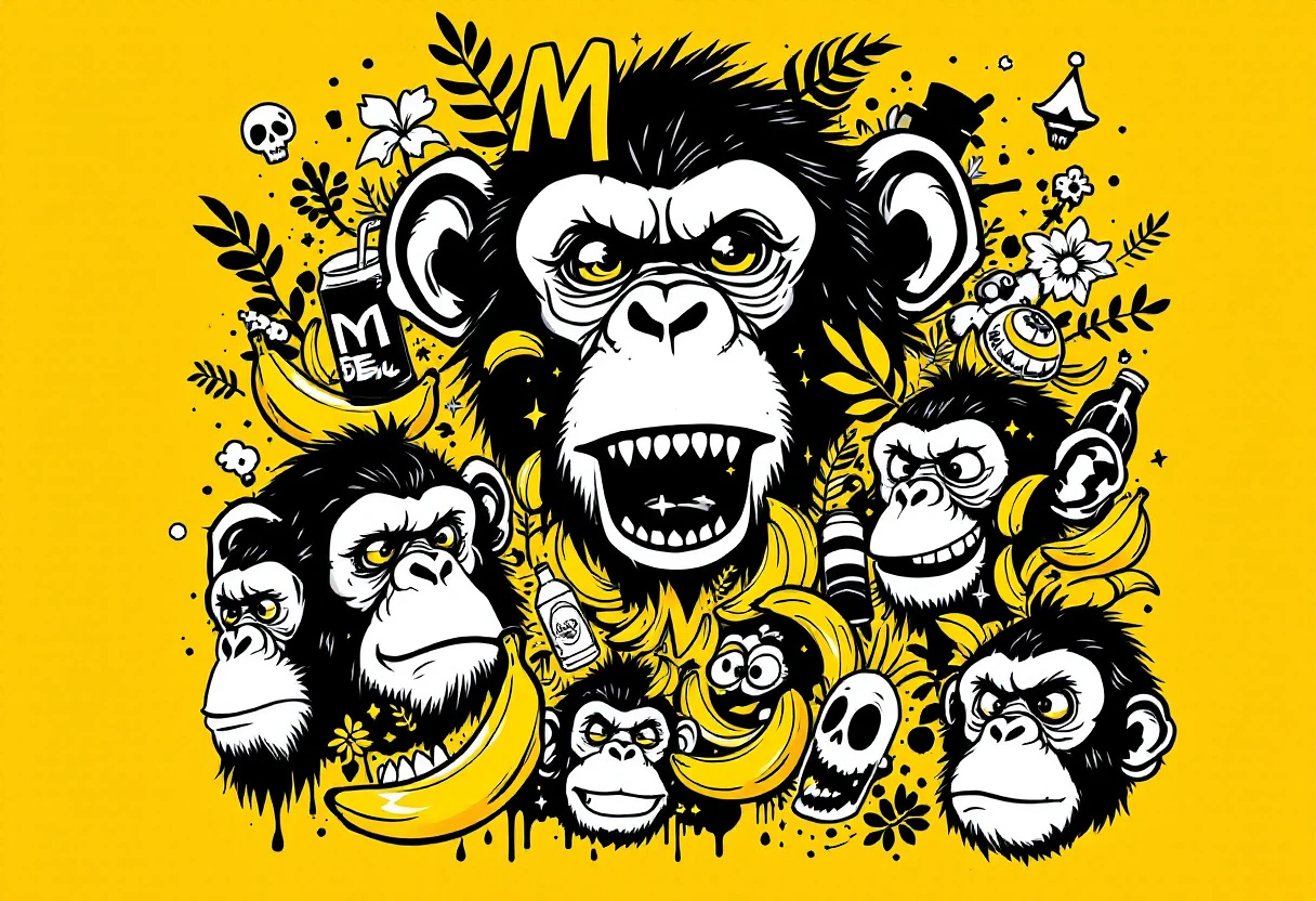 An intricate and mainly black and white, and yellow and dark green, (two contrasting, extra colors for details) , graffiti-style poster featuring various elements, such as cartoon characters, symbols of urban culture, and dynamic expressions, focusing on minimalistic chimp faces, the letter 'M', bananas, beer, is part of the image --ar 63:128 --stylize 750