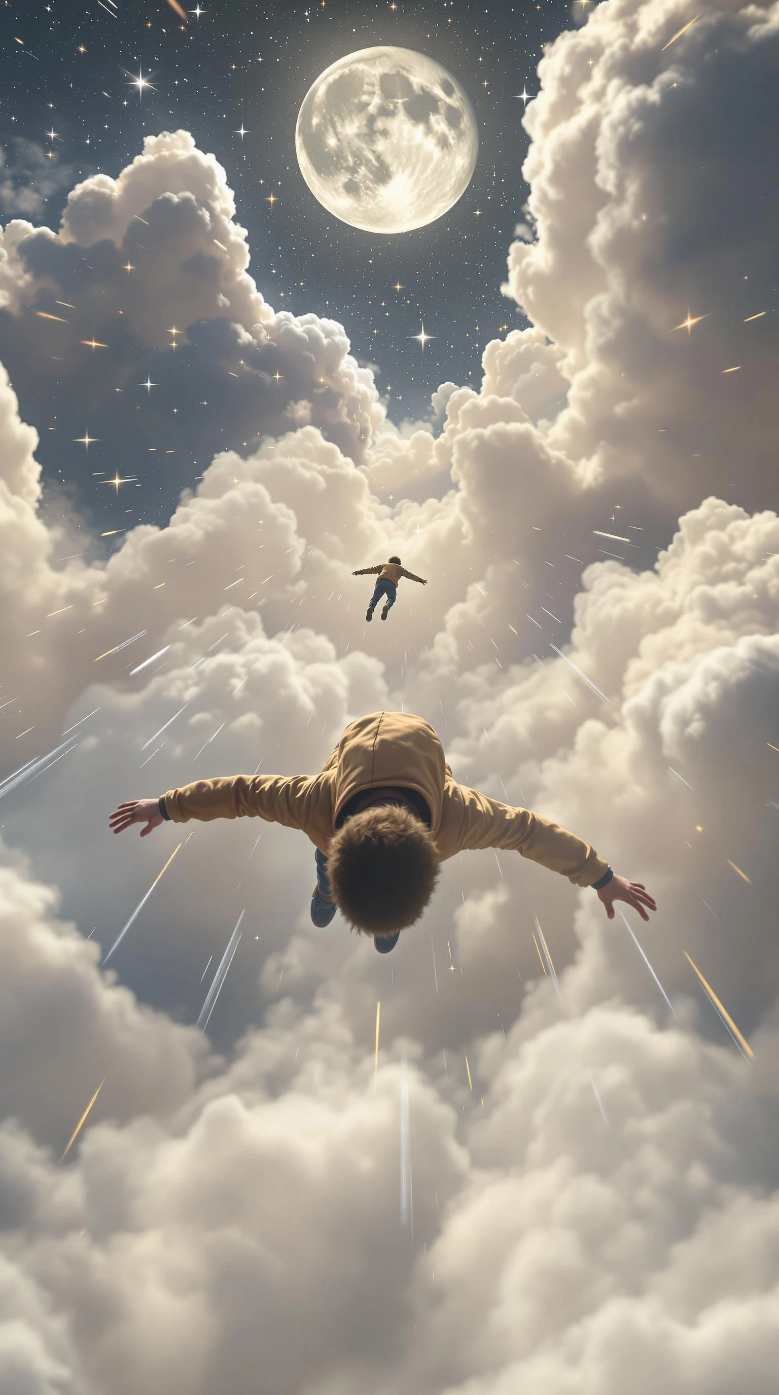 A rapid high-altitude tracking shot moves from a drone's perspective, capturing a surreal high-speed dream sequence of a little boy in a hoodie flying forward in a prone position, effortlessly gliding between the clouds, his body fully extended, arms outstretched to the sides, legs slightly apart, and head forward, capturing the sensation of smooth horizontal flight. His clothes flutter in the wind, and the camera closely tracks from a slightly higher vantage point, moving from left rear to right rear, maintaining a continuous view of the prone posture as the character swiftly traverses the scene. The environment is dynamic, with rapid changes, featuring clouds below, white clouds continuously sweeping backwards, a large moon hanging high in the distance, and a sparkling starry sky all around, with motion blur and light trails enhancing the sense of speed and fluidity. Fast movement.