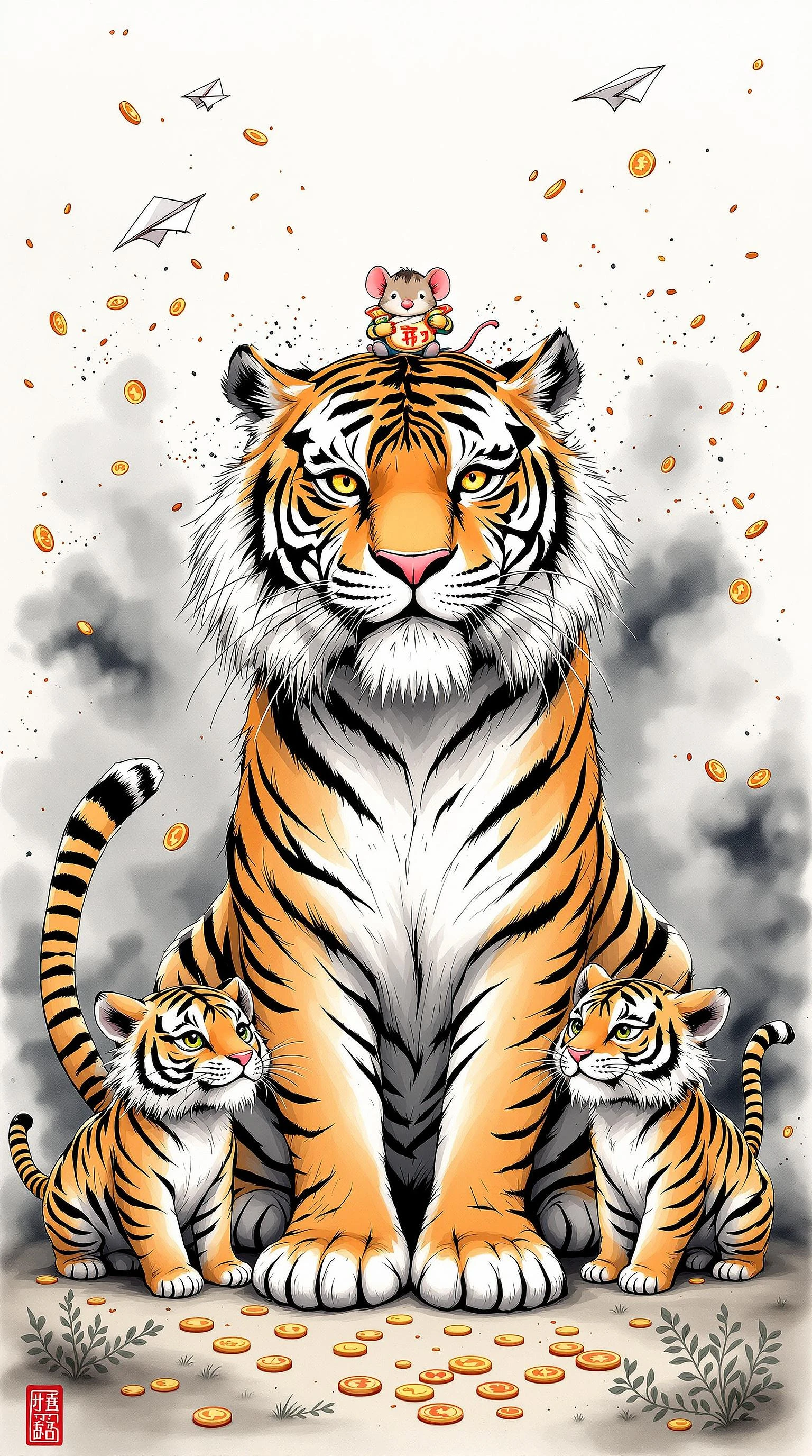 A big tiger and two little tigers, with a mouse on the big tiger's head, the mouse holding a talisman, the tiger holding a money bag, scattered copper coins and gold beans in the background, paper airplanes in the background, ink splashes above, rich in details, the tiger is the main subject, ink swirling around its body, in an ink wash style,masterpiece, best quality, original, wallpaper, colorful, covr, everyone, gradient_background, huge_filesize, highres, traditional_media, fine_art_parody, head tilt, ink style,watercolor_ (medium) ,