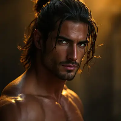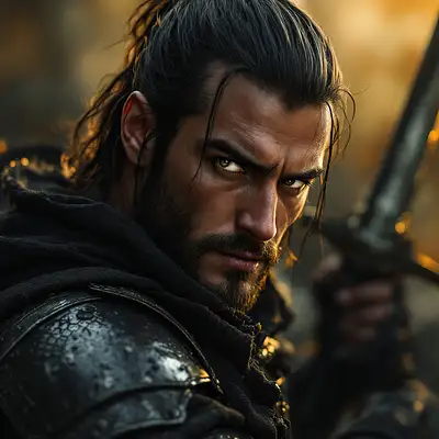 Hyper realistic cinematic dynamatic war scene of a strong, man, faint smile muscular body, shoulder-length dark hair, in half hair bun, hazel eyes, he is most handsome and attractive, powerful body, body builder, square jaw, wearing black meadival inspired, fighting leather armor, he holding a sword dynamatic war scene cinematic, war scene depth background is illuminated by a golden-hour glow, with soft shadows and a moody, dimly lit background. Highly detailed, dramatic lighting, ultra-sharp, depth, 4K resolution, cinematic style
