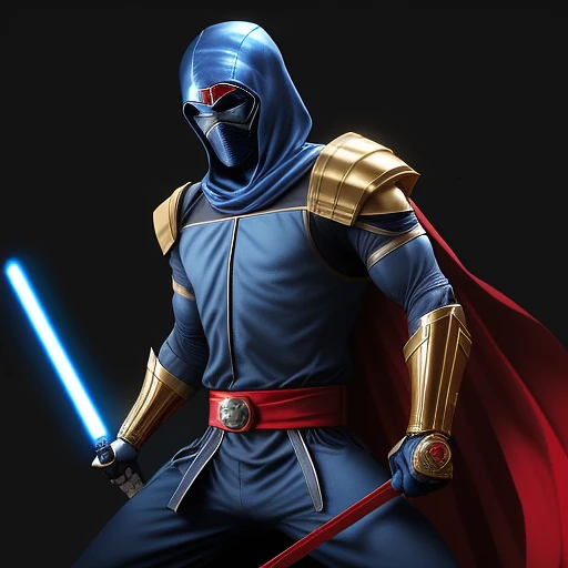 a tall black and blue ninja that looks like sub-zero with a sword and red belt, who is up against a a man in a RED SPANDEX SUIT, WITH GOLD GLOVES AND BOOTS , wearing a RED ranger helmet HOLDING a lightsaber