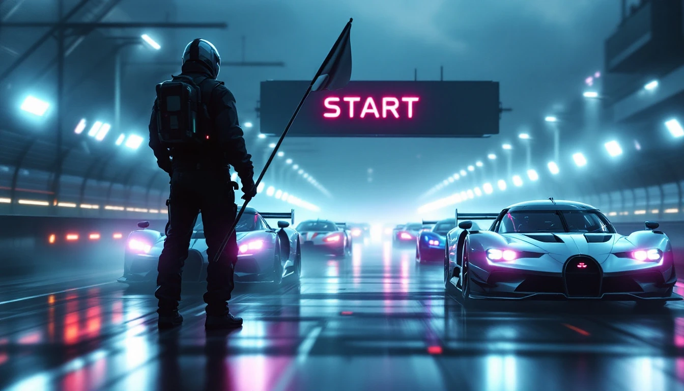 The start sounds and the starter stands on the side of the racing cars. Gives the go-ahead with a flag. cars take off. The camera looks from the side and slightly from above at all the cars and the person with the flag. Style - cyberpunk