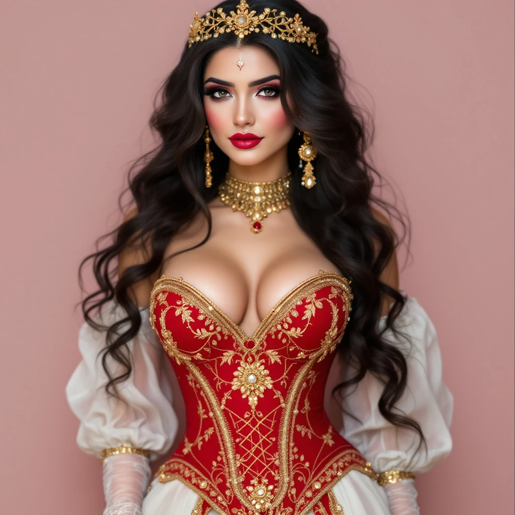 Femme arabe sensual magnifique déesse longue chevelure maquillée faux cils, eyes-Liner et rouge à lèvre sexy, elle est très attirante et vêtu d'un magnifique corset qui triple la taille de sa poitrine, traditionnel en or elle est ornée de centaine de bijoux d'or, le corset met en valeur sa magnifique poitrine, elle a des talon aiguille sa silhouette est digne d'une reine , une cicatrice sur son visage