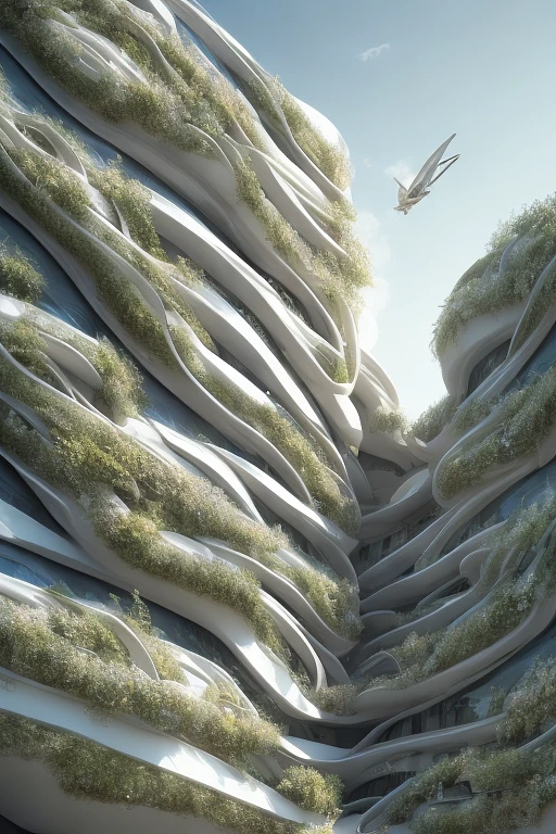 A aerial 3D rendering of a mid rise building inspired on the rose flower layers, Zaha Hadid style, unreal engine, raytracing, post-processing, zbrush, substance painter, trending on ArtStation, , Cinematic lighting, cinematic composition, rule of thirds , ultra-detailed, low contrast, natural lighting, fog realistic, light fogged, detailed, atmosphere, hyperrealistic , volumetric light, ultra photoreal, render in unreal engine 5, | 35mm | , Matte painting, movie concept art, hyper-detailed, insanely detailed, corona render, octane render, redshift render, 8k, --q 2