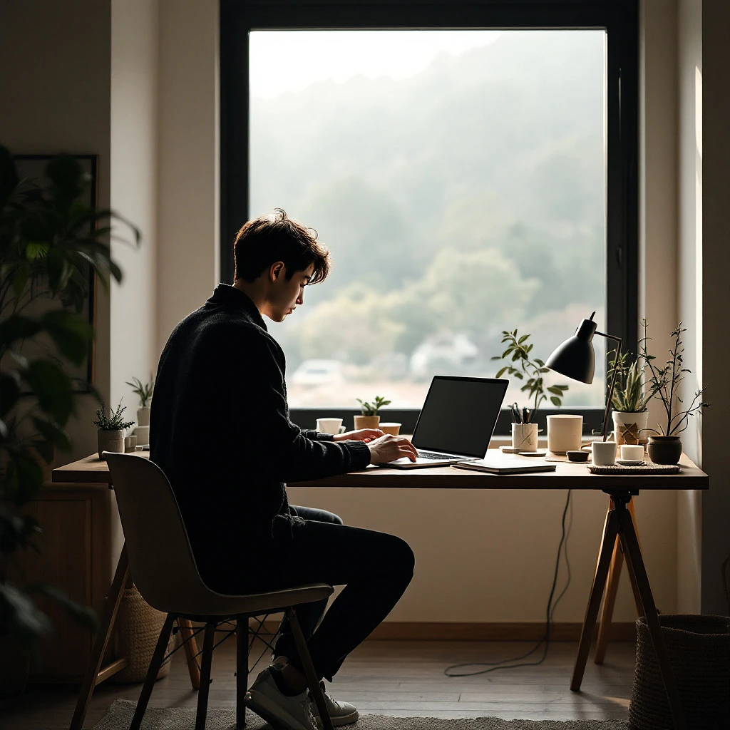 modern, minimalist workspace, focused designer korea hansome young man silhouete at a woodstyle desk, surrounded by objects of productivity and personal care, appearance of male back. high resolution photograph, used camera Sony α9 II with Sony FE 100-400mm f/4. 5-5. 6 GM OSS lens, emulating a high-contrast, positioned straight on for a candid shot, natural sunlighting through a large window, a woman in his late thirty years old, wearing a casual black over-knit, simple obje work on laptop with detail, an airy, well-lit room, tidy desk with personal items, blend of wellness and work, soft sunlight, diffused daylight illuminates the scene, attention to the man's engagement with his task and the neat arrangement of hers workspace, tranquility of a productive morning, a seamless blend of comfort and focus, high detailing, realistic, UHD, many details --ar 9:16 --style raw --stylize 700