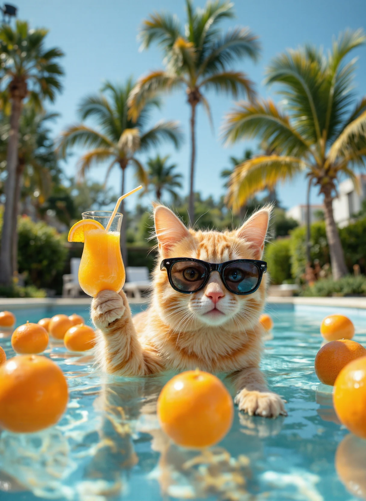 The image depicts a humorous and whimsical scene featuring an orange cat enjoying a swim in a pool. The cat is wearing stylish black sunglasses, which add a playful and cool vibe to the scene. The cat is holding a glass of orange juice with a straw, which complements its fur color and adds to the overall theme of the image. The pool is filled with water and surrounded by numerous oranges floating on the surface. The oranges are scattered throughout the pool, creating a vibrant and colorful atmosphere. In the background, there are palm trees swaying gently, suggesting a tropical or beach setting. The sky is clear and blue, indicating a sunny day. The overall scene is bright and cheerful, with the orange color scheme dominating the image. The cat appears to be relaxed and enjoying its time in the pool, adding a sense of fun and lightheartedness to the image.