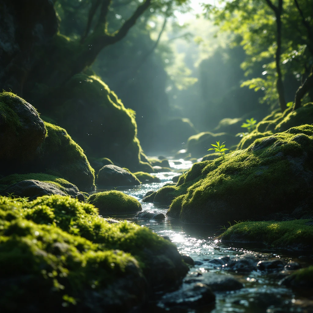 11. "Moss-covered rocks under dappled sunlight, cinematic realism, 3D"