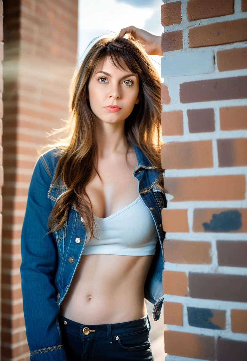 This is a photograph woman with long, wavy, bronze hair flowing over her shoulders leans up against the corner of a brick building. Her denim jacket is open and reveals a crop top showing off her fit midriff and some cleavage. The sky is partly cloudy and some sunlight is shining through the clouds. A large tree can be seen in the background. Light colored eyes stare at the viewer. silhouette style, casting shadow style, extremely intricate details, masterpiece, epic, clear shadows and highlights, realistic, intense, enhanced contrast, highly detailed skin, f/2. 8, bokeh