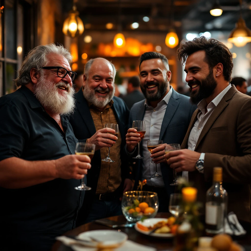 Group of 4 people: 1 guy 67 and fat, 1 guy 50 and successfull, 1 guy 50 and asian, 1 guy 45 years old project manager and caucasian. They are out partying having fun at cocktail-making event.