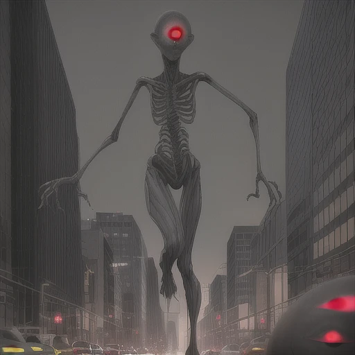 a classic grey alien extraterrestrial being/spindly arms and legs/big head/ large red glowing eyes- in the middle of a busy city-people running away/police chasing/ ahyper-realism/high detail/otane render/8k/hyper realism/high definition/dynamic photo realistic