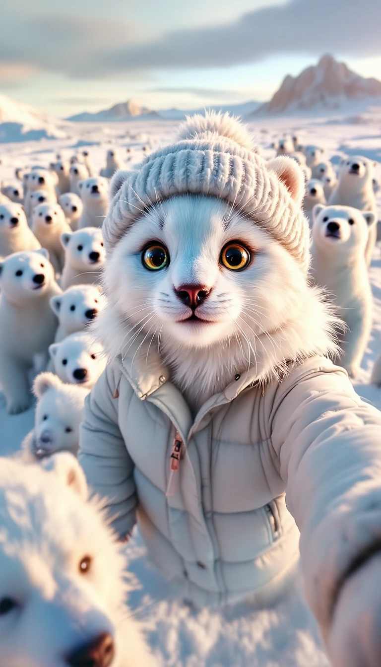 anthropomorphic, a cat named In the snow, there is an ice field with many polar bears standing on it. A real cute baby cat wearing a white down jacket and hat takes a selfie with gopro in front of them. The cat has big eyes, long fur, surrounded by more than ten small white polar bears, in the style of sunset light, hyper detailed