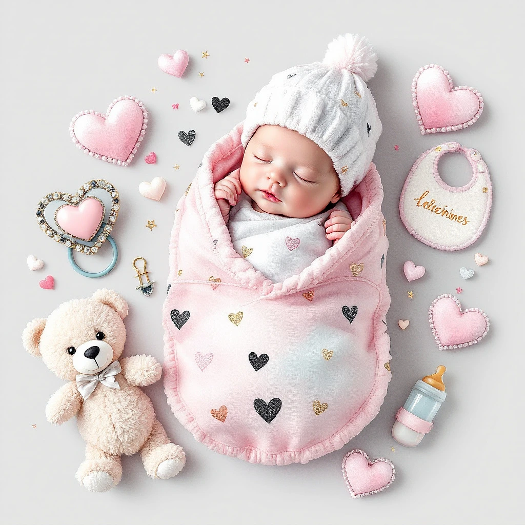 watercolor style chic bling glamours fabulous, cute baby raddle, pacifier, teddy bear, baby bottle. safety pin, bibb, pastel black metalic valentines heart patterns
