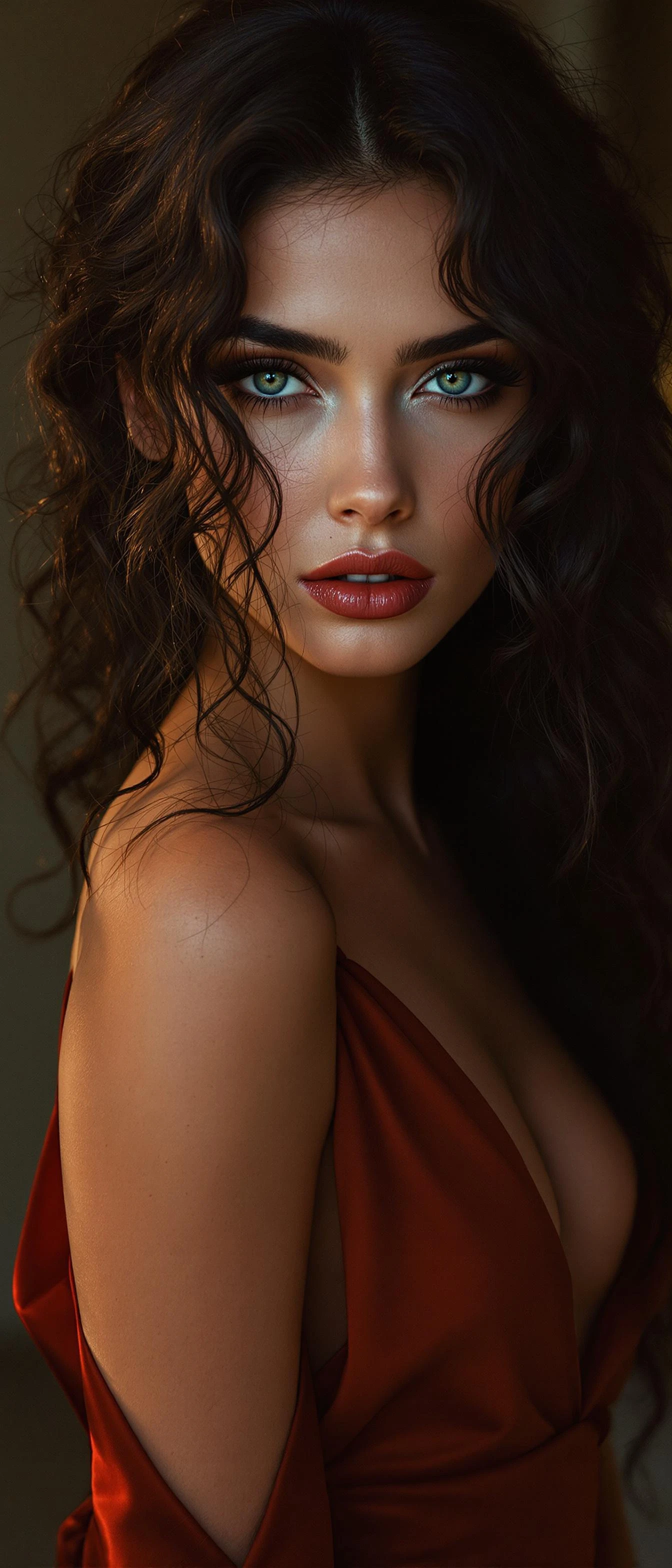 "Dramatic cinematic portrait photography featuring a lithe supermodel, fair skin, long raven black curly hair framing her face, captivating emerald green, blue, silver grey eyes, accentuated with dark makeup dressed in a crisp crimson silk dress. Warm golden hour lighting soft pastel colours, blurred background, soft contrast and saturation. Full body vertical shot. "