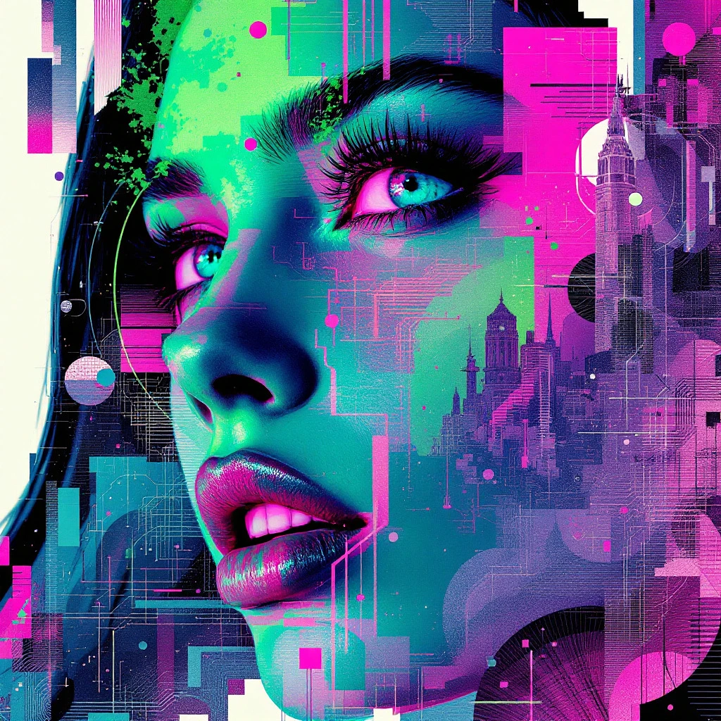 (masterpiece, digital art:1.3) , a highly intricate double exposure artwork inspired by Yuumei, featuring a close-up of a woman’s face, filling the entire screen. The perspective is slightly from below, capturing her face from a low angle with her mouth slightly open in a lascivious expression and her eyes wide open, drawing the viewer in with a hypnotic gaze. Her face is centered in the composition, taking up the full frame, with a captivating intensity. The background is seamlessly integrated with the woman’s face, featuring a futuristic cityscape that pulses with the energy of melodic techno. The design is infused with the chaotic graphic aesthetic of early 90s UK rave flyers. Bold geometric patterns, neon-colored splashes, and surreal fragmented visuals swirl around her face, merging with etched circuit board lines and dynamic audio waveforms that undulate like audio visualizers, syncing with the rhythm of the music. The neon technicolor hues of electric pink, lime green, deep purple, and cyan glow vibrantly, illuminating the entire scene. Retro rave elements like fluorescent light trails, acid house smiley faces, checkered patterns, and abstract graffiti are scattered throughout the design. Elements like cassette tapes, vinyl records, and acid house symbols add to the rave nostalgia, set against a backdrop of holographic grids and strobe lighting. Her face is minimalist yet striking, subtly highlighted with glowing tech accents, giving it a futuristic, sensual feel. The intricate details of the rave-inspired graphic elements are rendered in high definition, creating a stunning visual narrative that is both nostalgic and futuristic, with a dream-like atmosphere.
