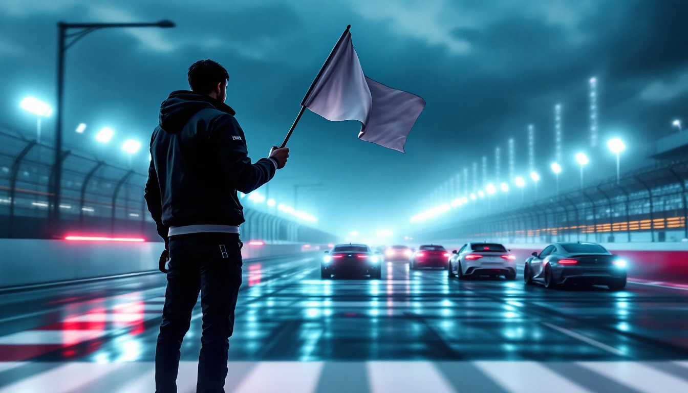 The start sounds and the starter is a man standing on the side of the racing track. Gives the go-ahead with a flag. The camera looks from the side and slightly above at a man with a flag and at 5 cars. Style - cyberpunk