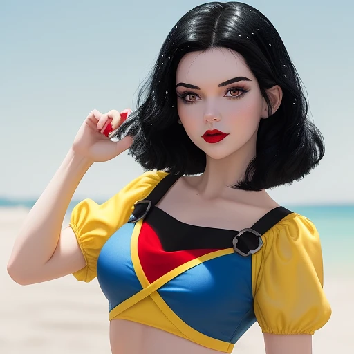 Sexy Snow White, a young woman with jet-black hair and wearing her colorful blue, yellow, and red dress crop top from Disney Perfect face summer day