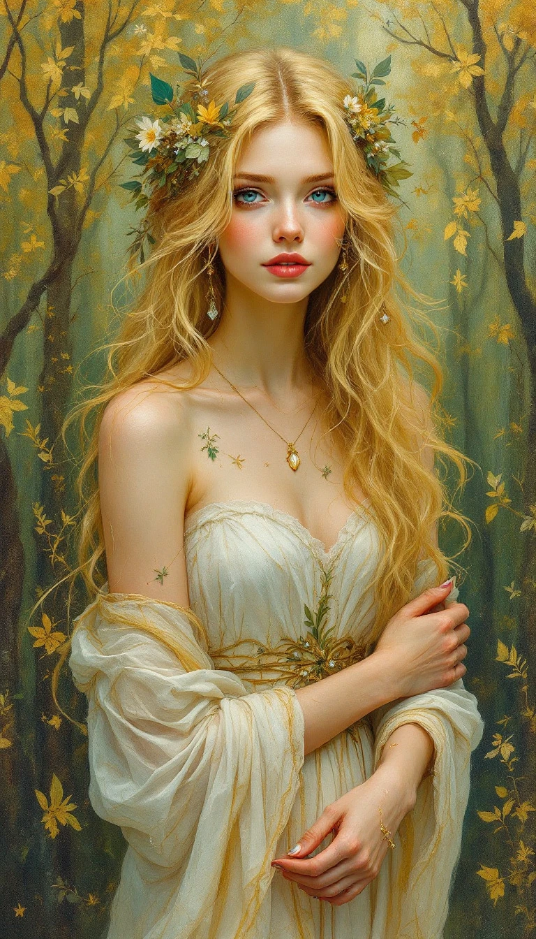 "Golden Enchantress in a Whispering Grove": A captivating abstract painting features an enchantress, exuding both charm and a connection to the natural world. She is a skilled practitioner of magic, depicted in a forest where the very trees seem to whisper secrets, with fair features, long, flowing blonde hair adorned with leaves and flowers, and a simple, elegant gown made of natural fibers. Herbs, crystals, and small charms are attached to her hands and arms. The artwork skillfully combines contemporary art with a figure depiction, creating a peaceful and enchanting scene using tones of golds, greens, and whites. Her kind, blue eyes, the composition's focal point, convey both a serene spirit and a touch of magic. After a day spent communing with nature, the enchantress embodies both grace and a profound connection to the world around her. The subtle textures and soft lighting invite the viewer to explore the hidden narratives within this vibrant piece, which is a painting.