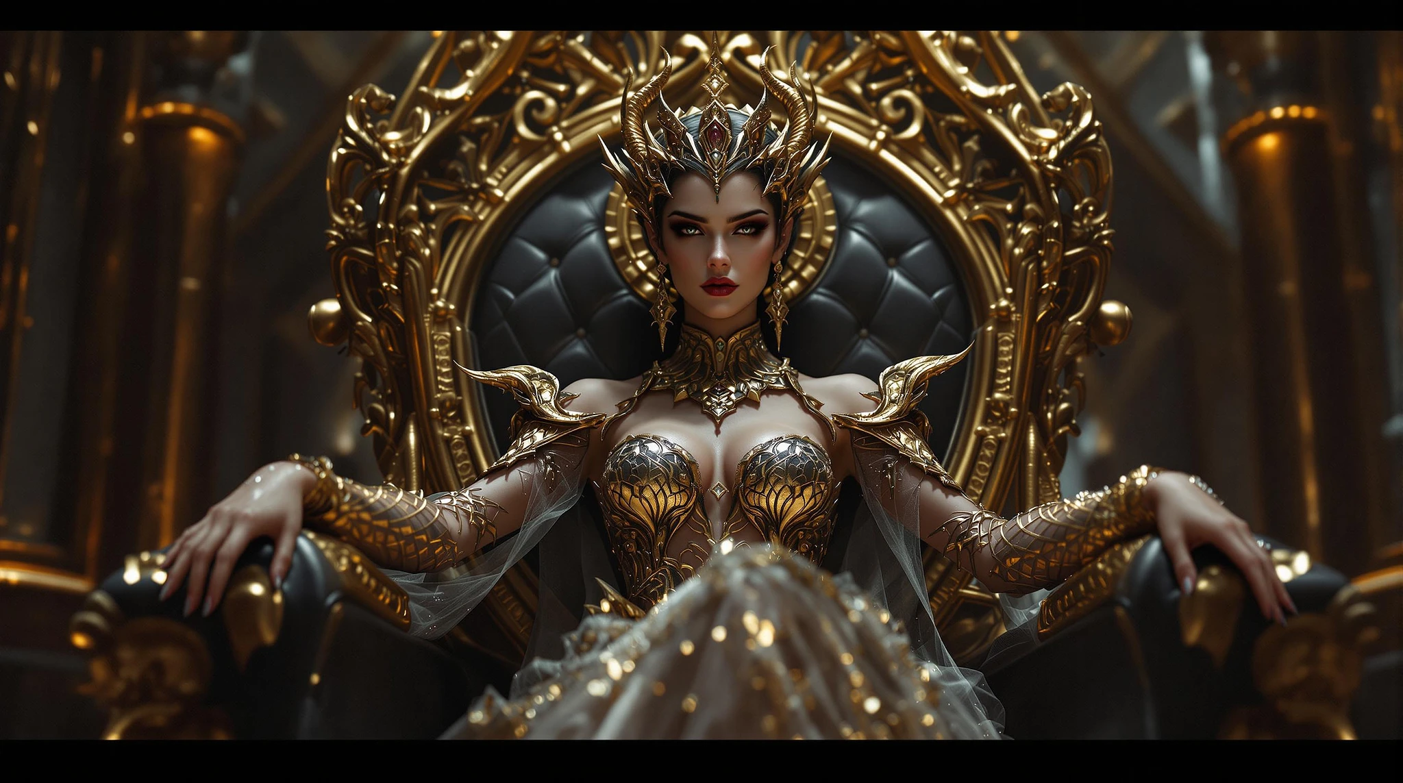 A very beautiful queen sitting on a black throne made of gold, with a serpent-dragon like elements and design, intricate details, dramatic lighting, hyperrealism, photorealistic, cinematic, 8k, unreal engine --ar 9:16 --niji 5 --style expressive --s 180