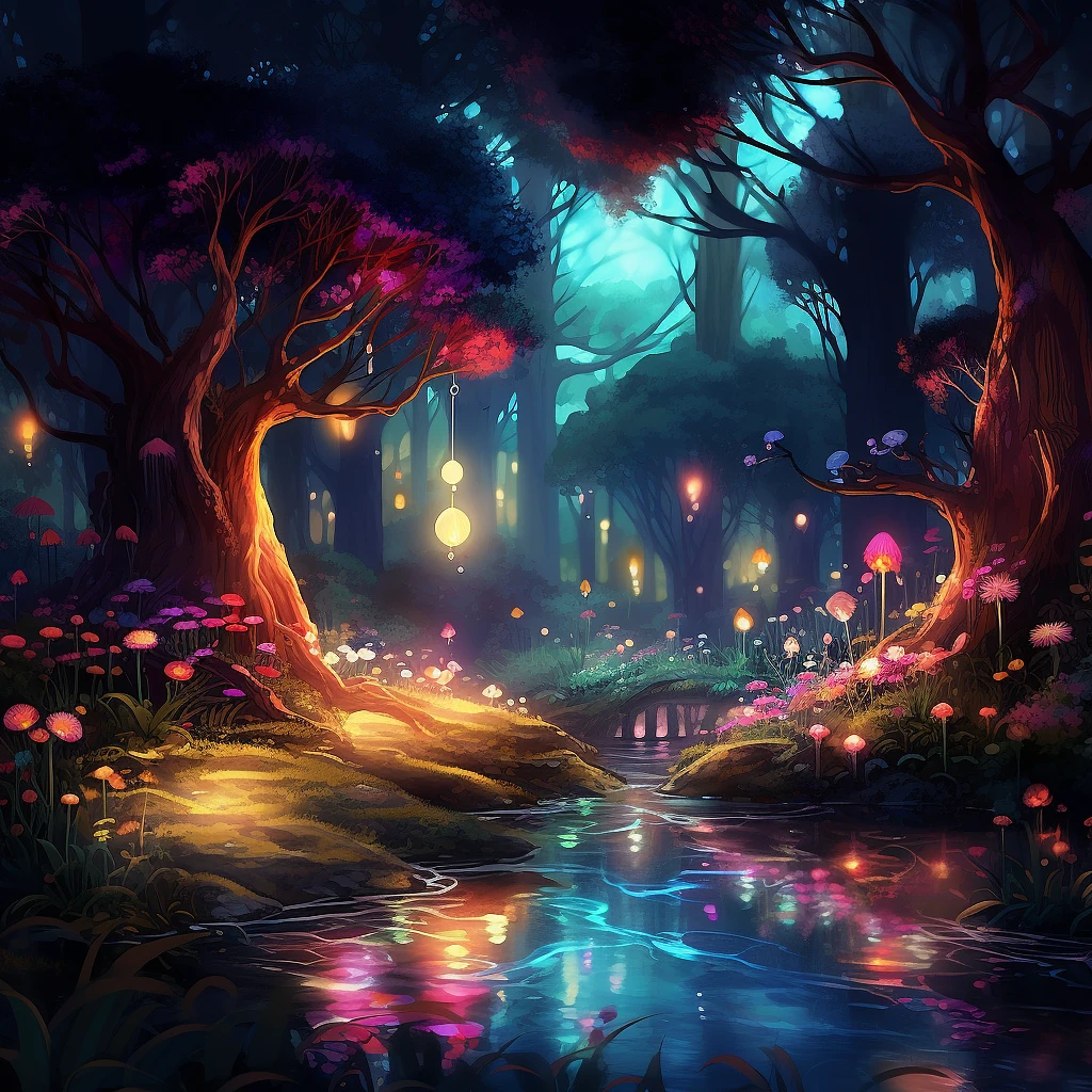 A vibrant and whimsical fantasy forest with magical creatures, glowing plants and a flowing river in a digital painting style inspired by video games such as Ori and the Blind Forest