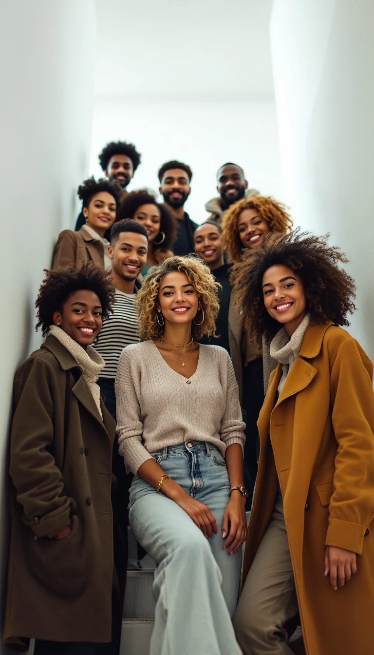 Photo of a 8 ultra realistic friends, different races of people, in a tight white modern stairway, men and women, in their 30s and 40s, some facing the camera, smiling, fashionable, in the style of hyper-realistic National Geographic photography, expressive, hyperrealism, photorealistic, detailed hair, hyper detail, cinematic lighting --ar 1:2 --stylize 750