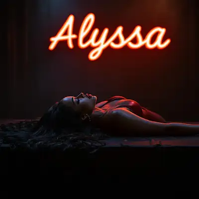 Create a photorealistic, cinematic stage scene featuring a curvy Black woman lying on her back on the 2 meter-long  table  during a live magic show. Her entire body is visible , showcasing smooth, warm dark brown skin with realistic textures (visible pores, natural body contours) . She is wearing a deep red  glossy  leotard. with natural  long   black  waist-length straight wavy hair spread beneath her. Her weight  about  75 kg .   Her measurement are  48" 36" 48".   She  has  thick  and soft  fat  hand and  legs  , and her entire head is covered with a black latex face hood only show her mouth . At the bottom of the box,   there a   glossy  black  tarp, with iridescent, shiny lighting. The background features a softly focused, glowing "Alyssa" neon sign, using a shallow depth of field for a DSLR-style cinematic blur. Lighting is natural and dramatic with strong shadows, realistic color grading, and rich skin tones. The image should be captured with a 50mm lens, emphasizing hyper-realistic human anatomy with no cartooning or painting effects - aiming for a real photograph aesthetic