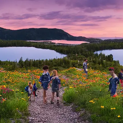 In Xinhaicheng Animation, as the sun sets in the west, boys and girls walk on the slope of the flagstone road, next to a clear and transparent lake, surrounded by wild flowers. High detail, film color palette, and lighting