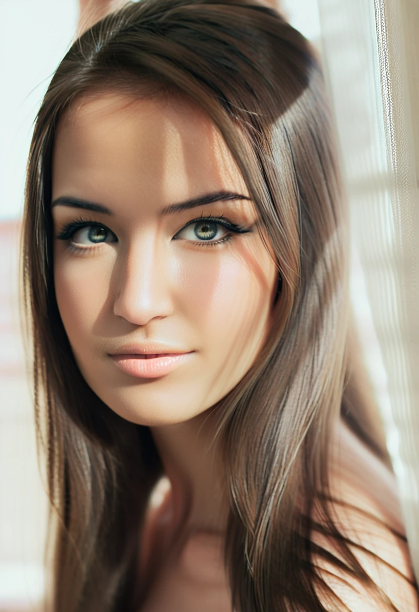 This is a photograph of a gorgeous woman with long bronze straight hair. She has light-colored perfect eyes and gorgeous full lips. This is a side view with her head turned to stare alluringly at the viewer. She leans against a window with intricately detailed white curtains. Sunlight shines through the window diffused by the curtains creating a silhouette effect. silhouette style, casting shadow style, extremely intricate details, masterpiece, epic, clear shadows and highlights, realistic, intense, enhanced contrast, highly detailed skin