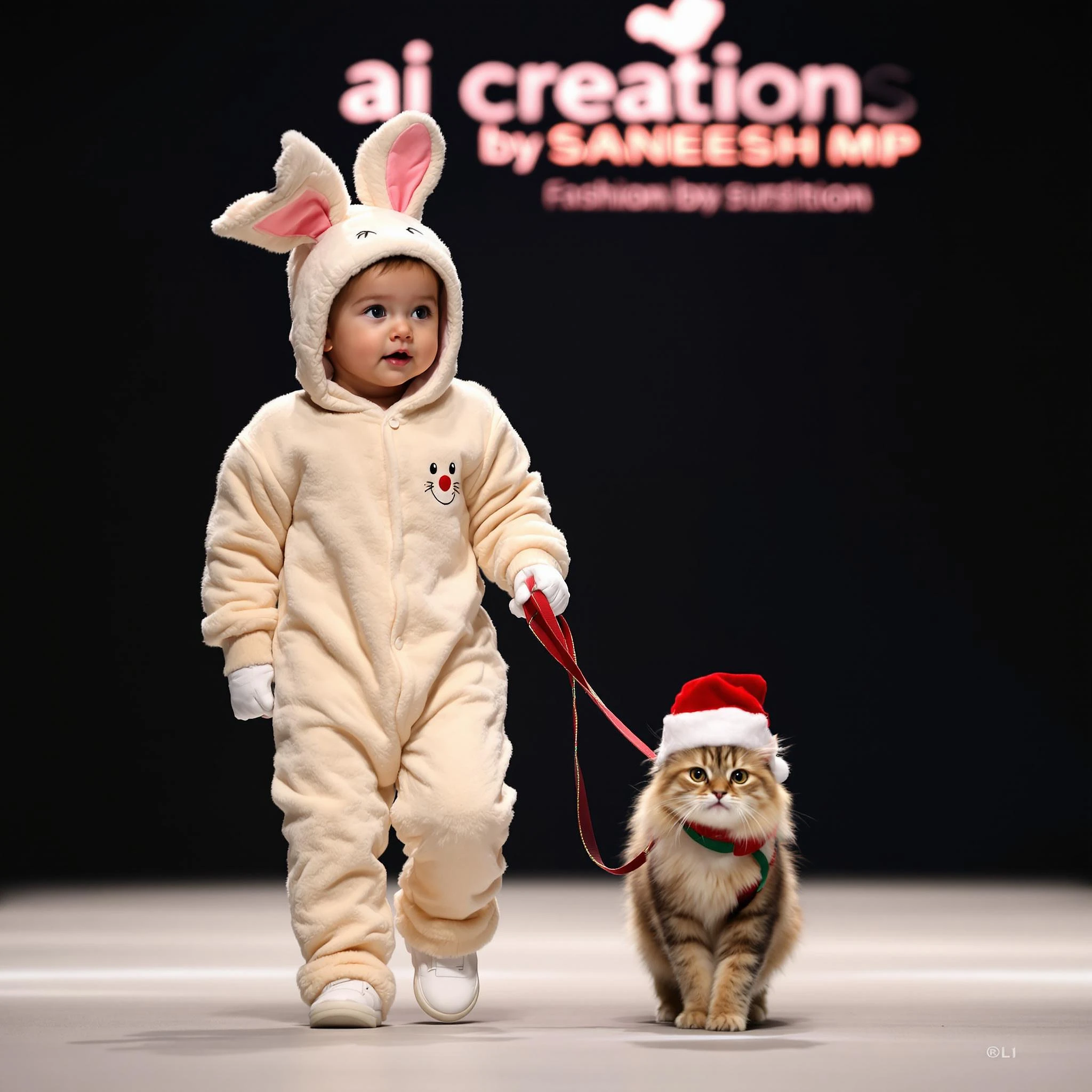 A baby dressed in bunny pajamas leads a pet cat on a leash while walking at a Ai creations by SANEESH MP fashion show, the cat is wearing a santa claus hat, with the logo illuminated in the background "Ai creations by SANEESH MP"