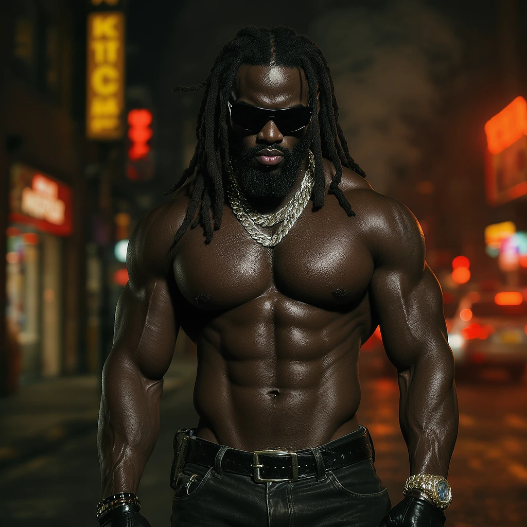 Create a cinematic picture of a black hitman, who has dreadlocks and has an amazing body, portray his physique
