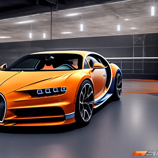 photo of a Bugatti Chiron pur sport, orange in colour, black wheels, showroom setting, showroom lights, pbr materials, reflections, super realism, 8k, unreal engine 5, super optimization, ultra settings