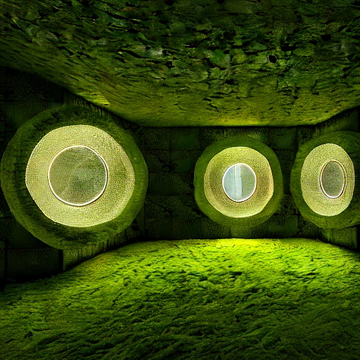 Realistic architectural rendering of an organic capsule inside wooden blocks organic design with moss and high rounded windows with lights inside, human scales, fog like London, elegant and generative design, nest, mesh structure, silkworm thread patterns, realistic , designed after Kengo Kuma, Sou Fujimoto, cinematic, unreal engine, 8K, HD, volume twilight, windows reflecting light, zaha hadid, ilustration