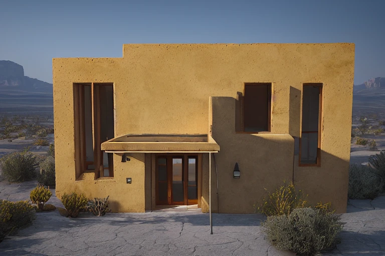 Ochre small modern villa, Persian architecture style, Ochre concrete, little windows, detailed, ultra-realistic, unreal engine, beautiful lighting, stunning desert environment, post-processing, 8k octane, de-noise, golden hour