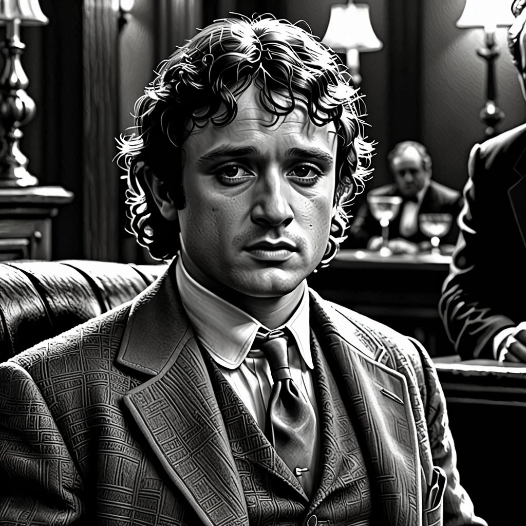 Frodo as the godfather, HD, Ultra HD, artstation, 8k, extreme detail, intricate details, grayscale, noir, stylized