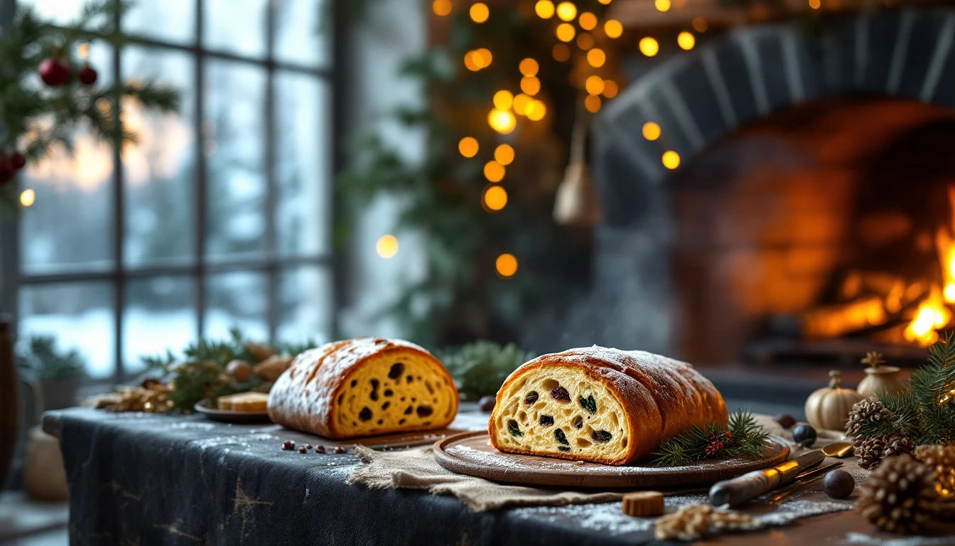 Still life with traditional Christmas stollen king bread, black and gold color palette, wood-burning oven, cozy atmosphere; 8k, intricate details, photorealistic, realistic light, wide angle, kinkfolk photography, A+D architecture