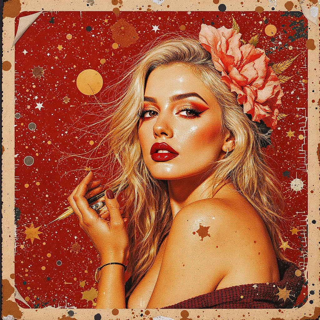 Blonde woman vintage poster, in the style of rustic simplicity, gritty reportage, kombuchapunk, rusty debris, hyper-realistic animal illustrations, red and amber, wide lens --chaos 75 --ar 1:2 --style raw --profile rsy6uq9 --stylize 750