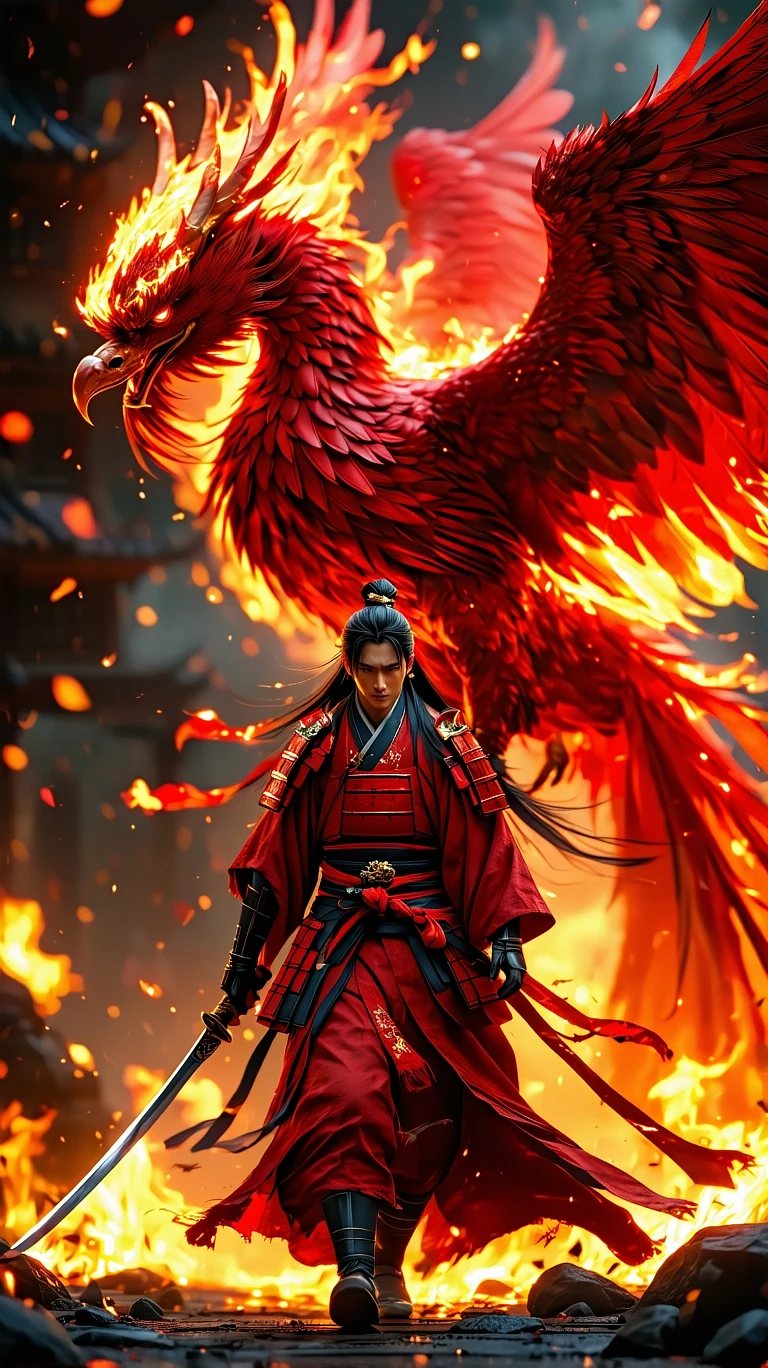 3D render hyper-realism, Ray tracing, unreal engine 5. A regal young Japanese samurai with long black flowing hair, wearing deep crimson intricate armor with golden accents, walks forward facing the camera with measured steps, he is holding his katana. Behind him, a colossal Phoenix spreads its massive flaming golden-red wings, flaming head, flaming eyes, and embers drifting through the air as the sky glows with a setting sun. Cherry blossoms swirl around them, caught in a warm breeze, as they exude an aura of unwavering determination and honor. Character design in the style of Yoji Shinkawa with a final boss concept feel. Phoenix design based on Final fantasy 7 Rebirth.