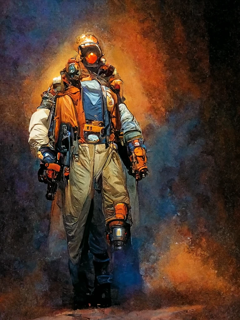 full body character, a space janitor antihero inspired a ww2 pilot. Starlord, Kyle Katarn, Jim Raynor. Painted by Drew Struzan, Joe Madureira. Dark fantasy lighting, soft muted colors. Orange overalls and blue --w 360 --h 480