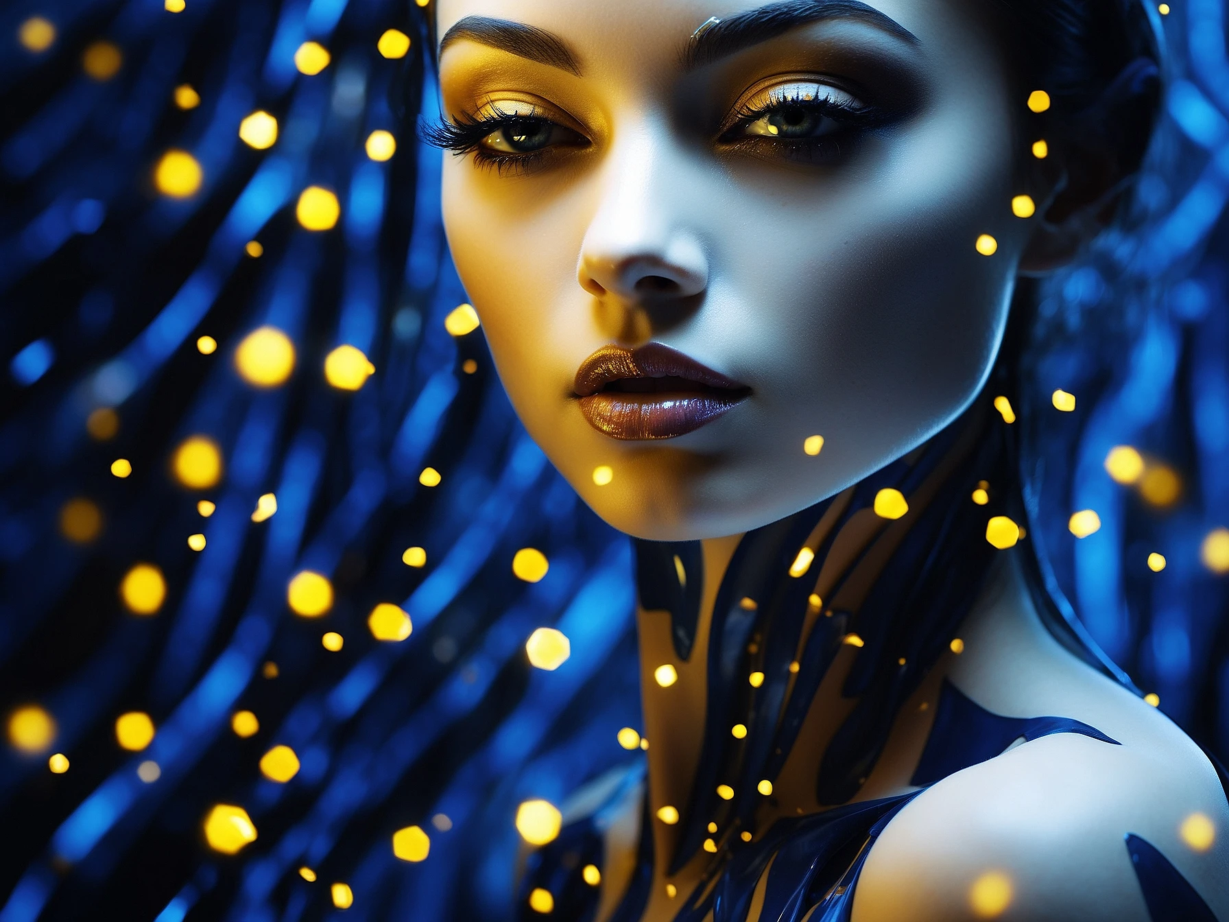 a woman with a blue dress and yellow lights on her face, an airbrush painting by Otto Pilny, behance, holography, behance hd, luminescence, daz3d