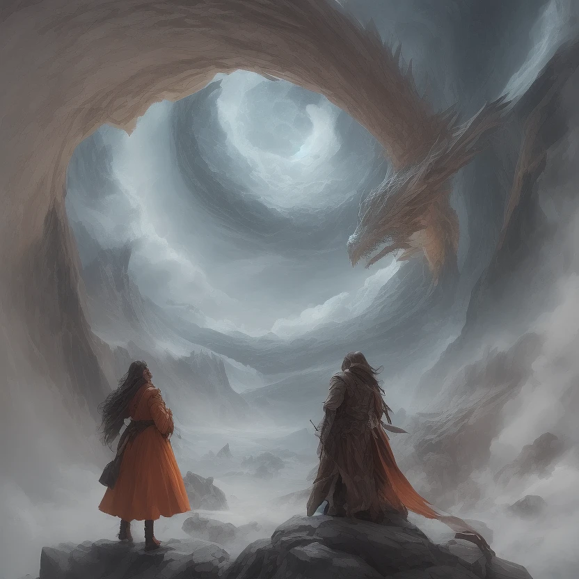 This image depicts a fantastical scene of a man and woman facing a dragon in a mountainous landscape. The woman, with long brown hair and an orange dress, stands beside the man, who wears a blue cape and holds a spear. A black dog sits to their right. A large, white dragon with red eyes and sharp teeth emerges from a swirling vortex of clouds and fire. The background features a mountain range with a cloudy sky and a bright sun shining through the clouds. The image has a fantasy art style, with vibrant colors and dramatic lighting.