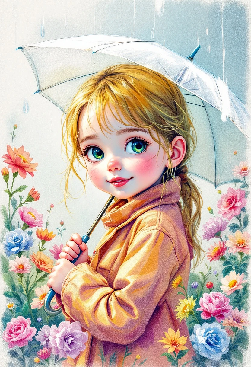 Sketch, Beautiful Colored Pencil Line Art, Beautiful Curves, Brush Technique, Artistic, Beautiful, 5-Year-Old Chubby, Cute, Blonde Hair, Rainy Season, Image of a Cute Girl with an Umbrella, Surrounded by Colorful Flowers, Expressing Emotions in a Beautiful Line Drawing Style, Perfect Composition Impressive Details and Beautiful Rendering, Trending on ArtStation, 8k Art Photography, Realistic Conceptual Art, Perfect Light in Natural Volumetric Filming, Soft Light and Shadows, Award Winning Photography, Masterpiece, Oil on Canvas, Raphael, Caravaggio, Greg Rutkowski Beeple, Beksinski, Giger