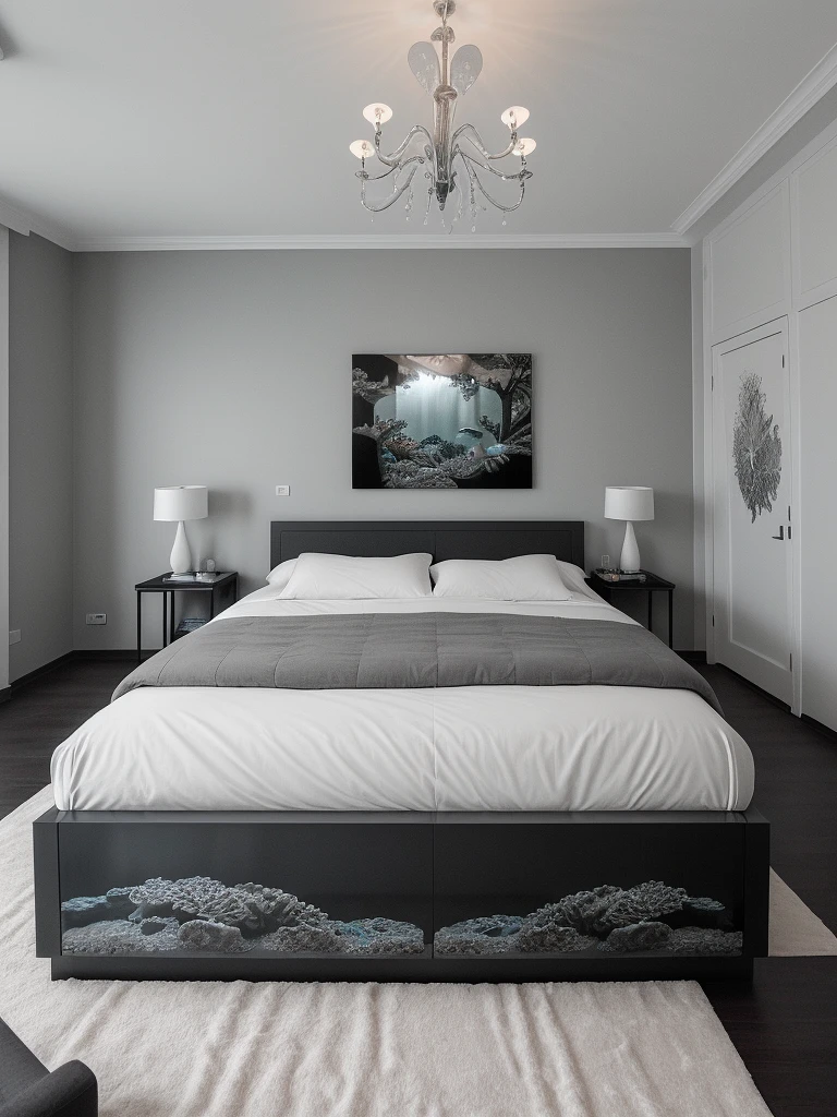 Ultra high detailed photo of dark grey Aquarium Bed in a white interior luxury bedroom, silver strokes --ar 4:7