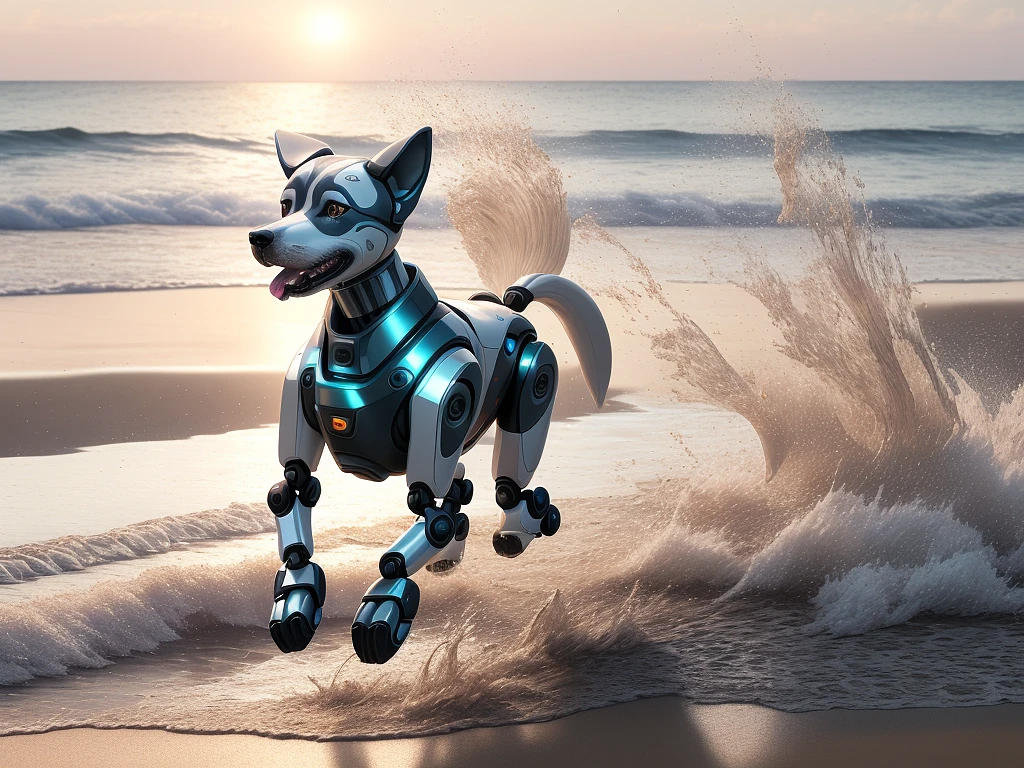 Photo of a ultra realistic robot dog running on the beach, splashing water and sand, happy scene, evening light, high detail, Full HD, 8K UHD, HDR, --ar 16:9, --w 1024, --h 768, --v 4, --q 2