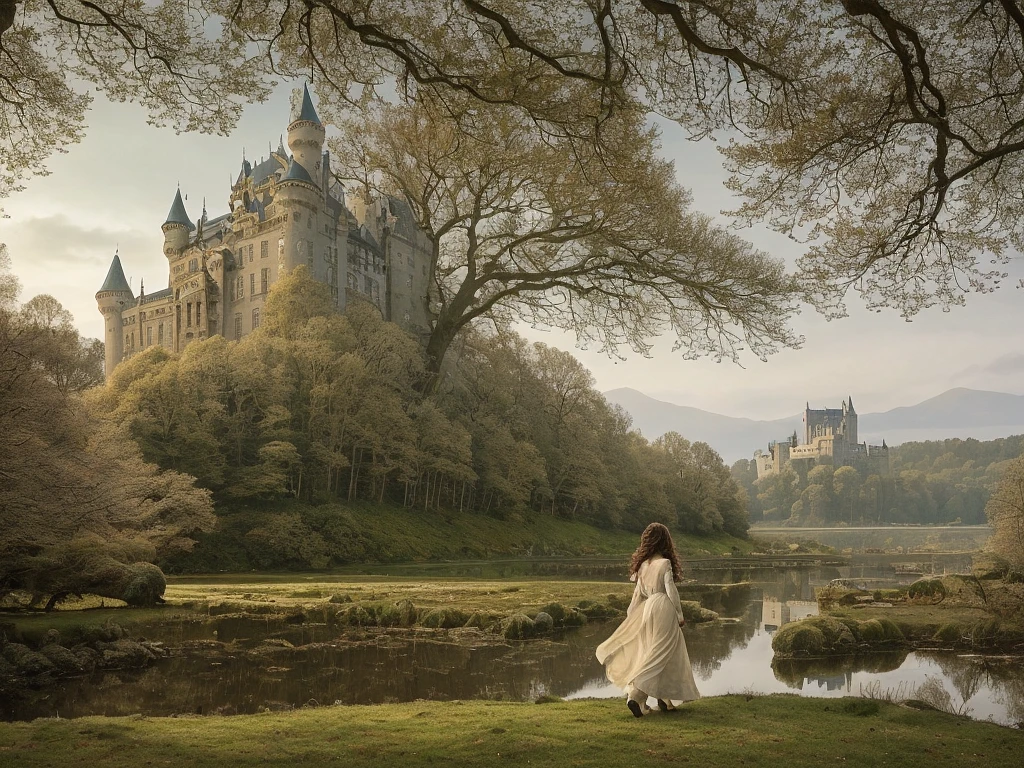 a serene and enchanting scene of a woman walking towards a majestic castle in the distance. The atmosphere is one of wonder and awe, inviting the viewer to step into this magical world. The woman has a slender yet elegant figure, with fair skin and long, curly brown hair that falls down her back like a cascade of chestnut locks. Her hair is partially covered by a wide-brimmed hat that matches her coat, adding a touch of mystery and allure to her overall appearance. The woman is dressed in a long, dark blue coat that reaches down to her ankles, with a fitted waist and a flared skirt that accentuates her feminine figure. The coat is adorned with intricate buttons and embroidery, adding a touch of luxury and refinement to her overall appearance. She is also wearing a white blouse with a high collar and a black skirt that peek out from under her coat. Her attire is completed by a pair of black boots that are knee-high and have a low heel. The woman is not wearing any visible jewelry, adding to the sense of simplicity and elegance that pervades her overall appearance. Her makeup is subtle and understated, with a focus on enhancing her natural features rather than making a bold statement. Her eyes are brown and almond-shaped, with a subtle sparkle that suggests a sense of curiosity and wonder. The castle in the background is a majestic and imposing structure, with tall spires and towers that seem to stretch up to the sky like giant's fists. The castle's walls are made of rough-hewn stone, with a subtle texture that suggests a sense of age and history. The castle's windows are narrow and pointed, with a subtle glow that suggests a sense of warmth and welcome. The castle is surrounded by a lush and vibrant forest, with trees that seem to stretch up to the sky like giant's pillars. The forest floor is carpeted with a thick layer of leaves and ferns, with rocks and roots scattered throughout. In the distance, the sky is a kaleidoscope of colors, with shades of blue, orange, and yellow that seem to blend and merge in a subtle dance of light and color. The lighting in the image is soft and warm, with a sense of depth and atmosphere that draws the viewer in. The sun is setting in the distance, casting a warm glow over the scene that seems to bring out the vibrant colors of the forest and the castle. The camera perspective is wide-angle, providing a sense of depth and space that draws the viewer into the scene. The camera is positioned at a low angle, looking up at the castle and emphasizing its height and grandeur. The style of the image is reminiscent of a romantic landscape painting, with a focus on capturing the beauty and mystery of the natural world. The use of soft lighting, muted colors, and subtle textures creates a sense of tranquility and wonder, drawing the viewer into the peaceful world of the image. The camera used is likely a digital SLR camera, with a wide-angle lens and a high ISO range. The image has been processed to enhance the contrast and color saturation, creating a sense of depth and dimensionality that draws the viewer into the scene.