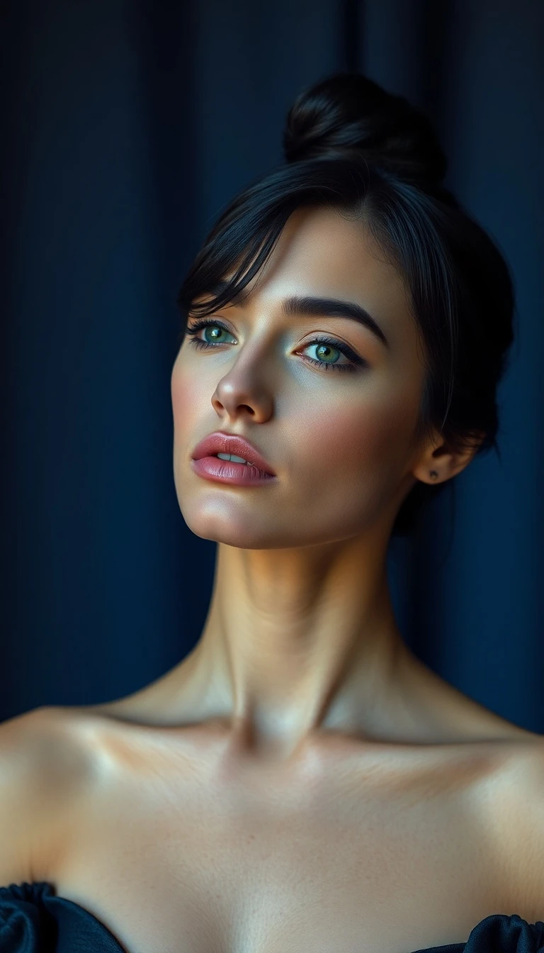 "A cinematic style fine art photograph, with gentle, soft light and soft pastel colours, features a close-up head and shoulders portrait of a supermodel in her early 20s. head tilted slightly left, Her luminous complexion is sculpted by Rembrandt lighting. She has raven black hair in a bun, vivid green-silver eyes turned to her right looking into camera, full parted pink lips. A navy blue silk backdrop offers harmony, with a muted golden rim light adding depth. The diffused shadows, subtle illumination, and soft contrast create a serene, confident mood. Photographed with a Sony A1 and 120mm lens for high resolution and an editorial style. "