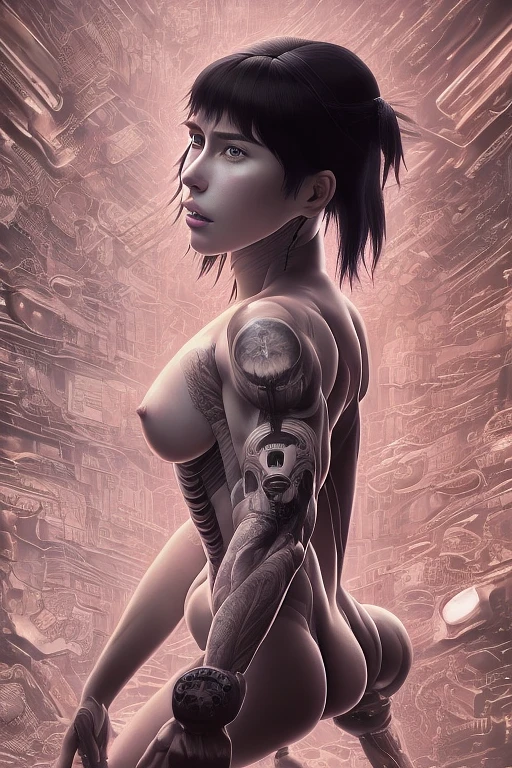 digital painting by greg rutkowki, ghost in the Shell with tattoos, full body, full of sin, perfect body, red, perfect face, bare skin, intricately detailed beautiful face, supermodel, fantasy, photorealistic, photorealism, trending on artstation, cute big circular reflective eyes, trending on artstation, sharp focus, studio photo, intricate details, highly detailed, by greg rutkowski